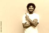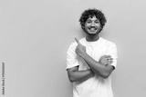 young indian man in white t-shirt pointing at copy space and smiling on yellow isolated background, curly guy showing and advertising empty space