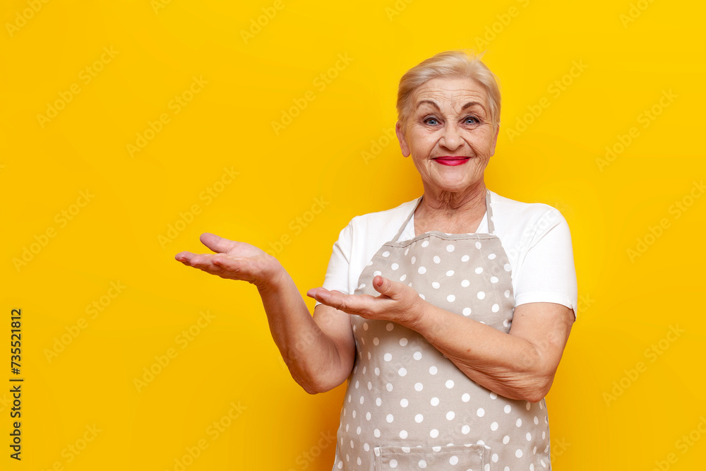 cheerful old grandmother housekeeper in apron points with hands at copy space on yellow isolated background, elderly woman housewife showing and advertising empty space