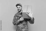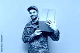Ukrainian army soldier in pixel camouflage uniform holds a box on a yellow isolated background, Ukrainian military cadet carries and gives humanitarian aid and donation