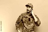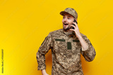 Ukrainian army soldier in a pixel camouflage uniform talks on the phone on a yellow isolated background, a Ukrainian military cadet communicates via mobile communication