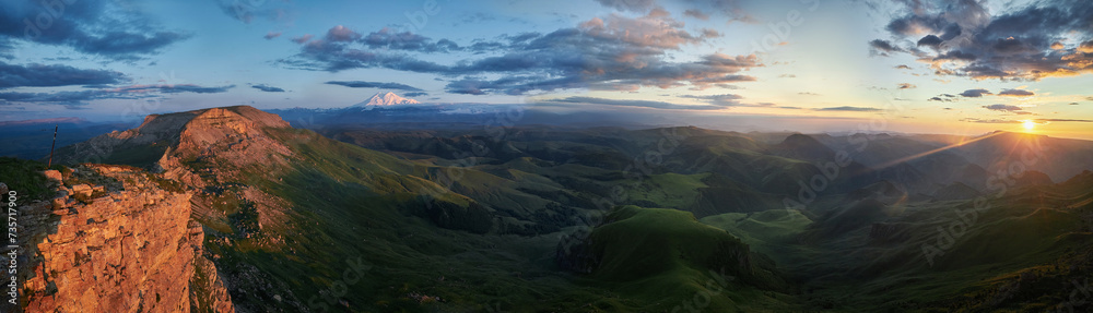 Landscape of Caucasus Bermamyt Canyon, stunning natural wonder awaiting adventurers. Mountains and rocky cliffs create a breathtaking panorama. Ancient geological formations and rugged beauty