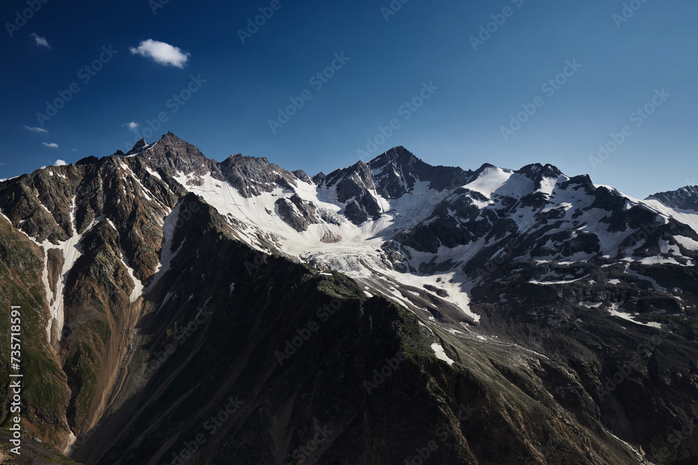 Nestled in Russia Caucasus, majestic mountain landscape captivates with its snow covered peaks, serene glaciers and rugged rock formations