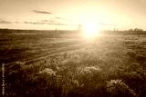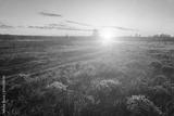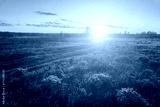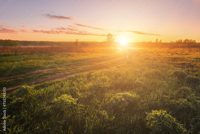Sunrise in a spring field with green grass, lupine sprouts, fog on the horizon and clear bright sky. Springtime landscape. Vintage film aesthetic.