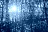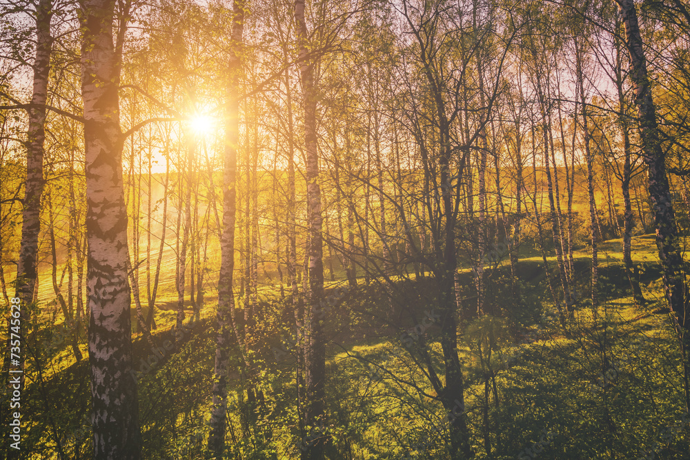 Sunset or sunrise in a spring birch forest with bright young foliage glowing in the rays of the sun and shadows from trees. Vintage film aesthetic. Springtime landscape.