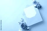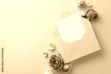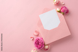Happy 8th of March frame. A top view capture of a revealing envelope, emotive card, paper heart cutouts, and radiant rose petals on a soft pink background, reserving space for text or marketing