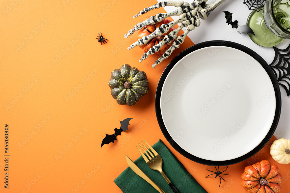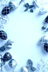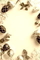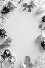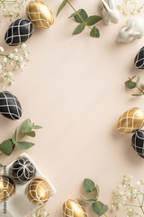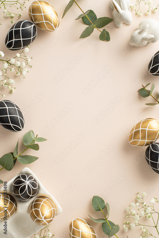 Deluxe Easter concept: Vertical top view of luxurious black and gold eggs in ceramic holder, hare figurines, eucalyptus, gypsophila, arranged on pastel beige background, with blank space for text