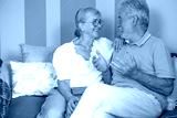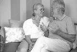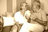 Happy loving bonding retired elderly couple sitting on sofa at home discussing and smiling, enjoying carefree moments together in good mood and harmony