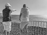 Rear view of senior couple of caucasian males friends in sea vacation enjoying sunny day and happy retirement lifestyle standing face the horizon over sea