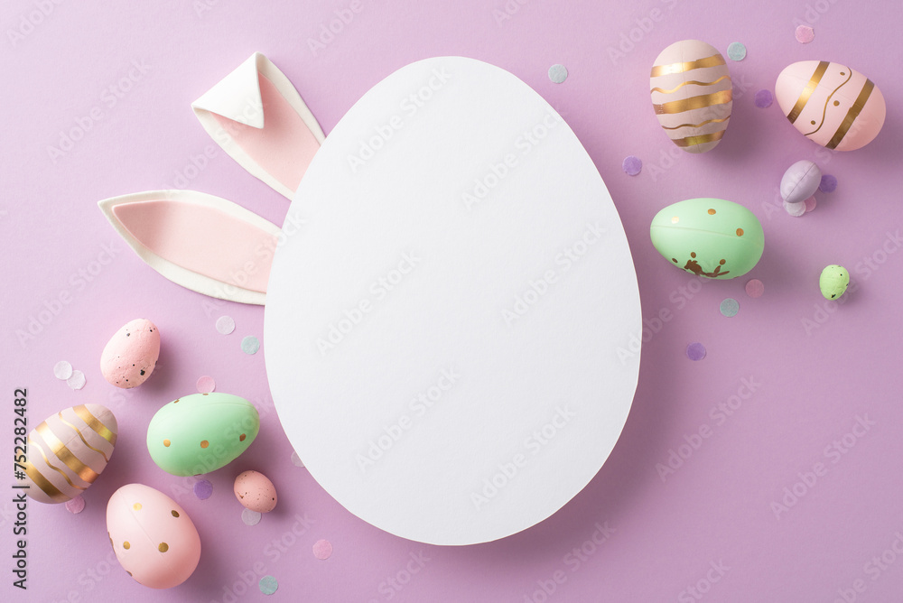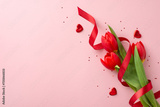 Dreamy love reveal concept seen from the top view, with sparkly red sequins, heart figures, and a bouquet of fresh tulips with a ribbon, all laid on a gentle pink background, space for message