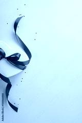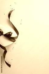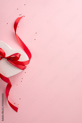 Lovely feminine present idea: top view vertical image of a heart-shaped present tied with a red bow, surrounded by shimmering sequins on a blush pink base, ample space for wording or adverts
