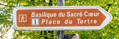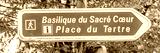 Sacred Heart basilica and Place du Tertre square sign in a street of Montmartre hill in Paris, France