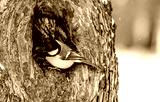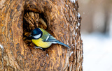 A tit on a tree trunk in close-up.