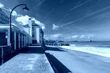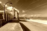 Sunny promenade and beach of beautiful walled port city of Saint-Malo at high tide, Brittany, France