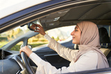 beautiful young Muslim woman in veil adjusts car rearview mirror to start driving