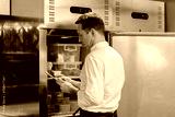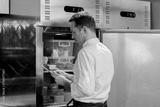 professional kitchen chef looks into the fridge and chooses ingredients for cooking food concept