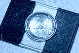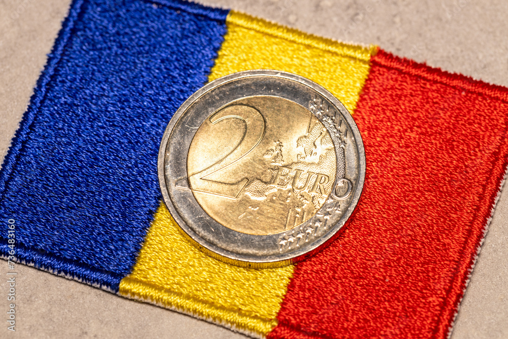 2 euro coin and Romanian flag Concept, Conversion of Romanian lei to euro, Adoption of the common European currency by Romania