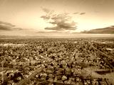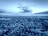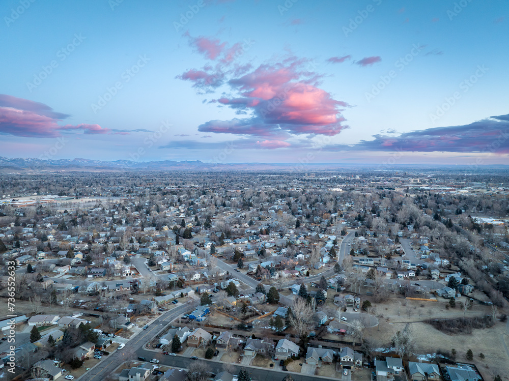 winter dawn over city of Fort Collins and Front Range of Rocky Mountains in northern Colorado