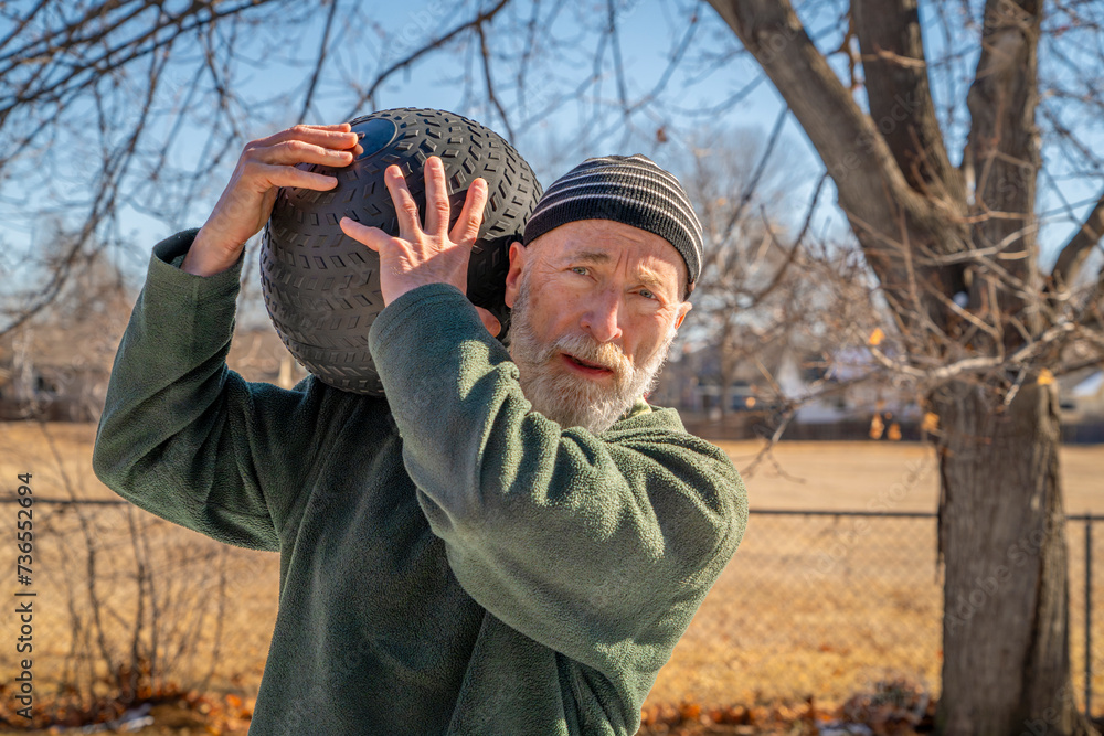 senior man is exercising with a heavy, 50 lb, slam ball in his backyard, sunny winter day