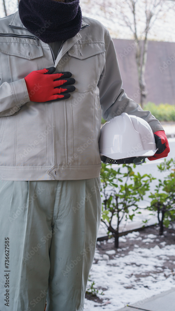 ネックウォーマーで防寒対策をする作業服の男性と積雪風景
