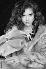Beautiful fashion brunette girl in mink fur coat isolated on bla