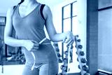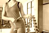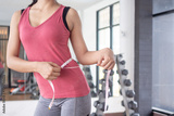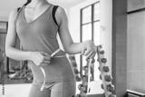 Diet and dieting. Beauty slim female body use tape measure. Woman in exercise clothes achieves weight loss goal for healthy life, crazy about thinness, thin waist, nutritionist. Fitness