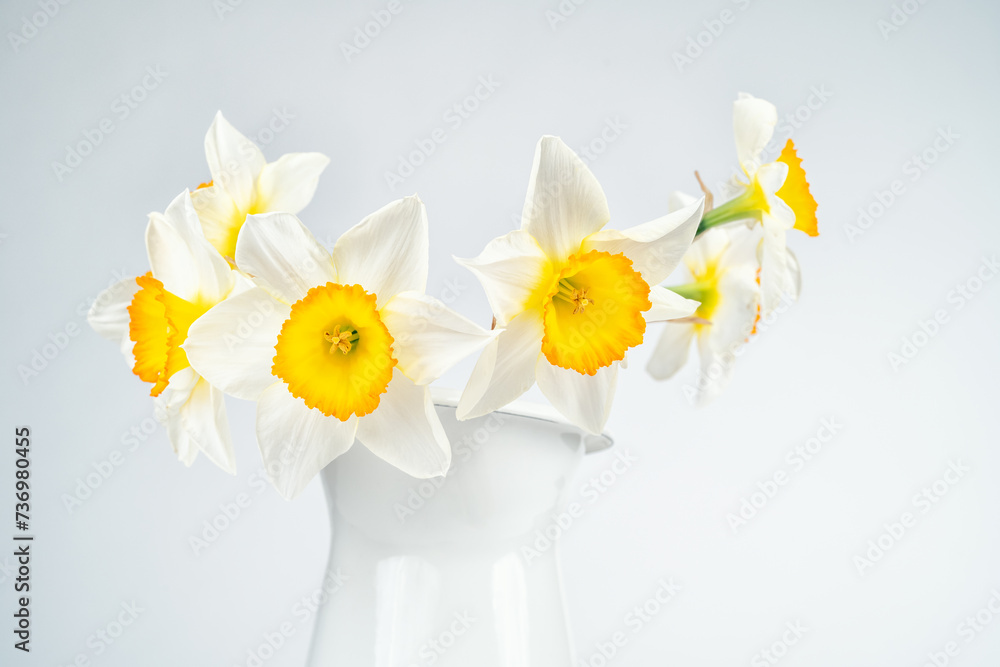Still life with a blooming bouquet of white daffodils in a white vase on a white background