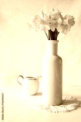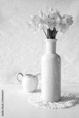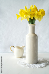 Still life with a blooming bouquet of yellow daffodils in an elegant porcelain vase on a textured white background