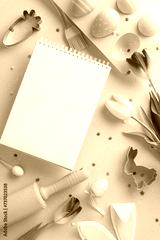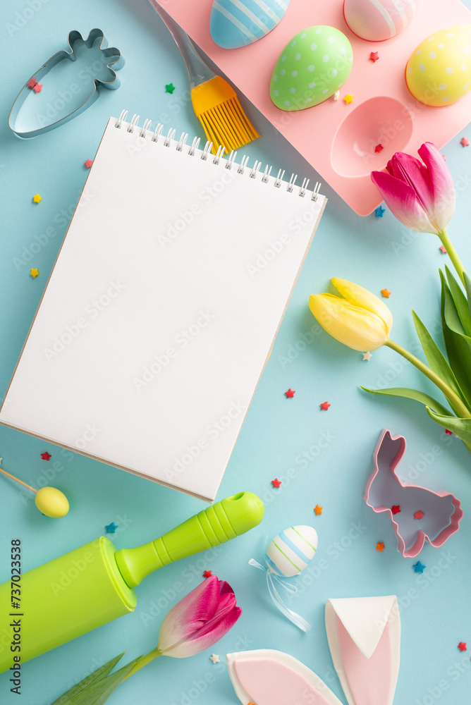 Baking for Spring Celebration theme. Overhead vertical shot of table adorned with baking tools, recipe book, egg-shaped treats, cute bunny accessories, tulips on soft blue backdrop. Ideal for text