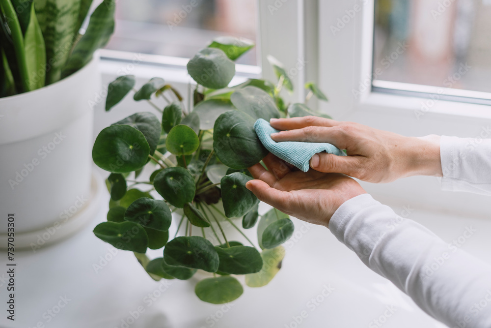 Closeup on woman hands with wet cloth wipe leaf and remove dust from plant