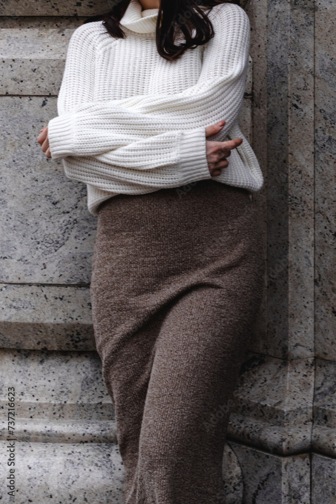 Fancy details of white knitted sweater and long brown skirt. Winter outfit and women's fashion