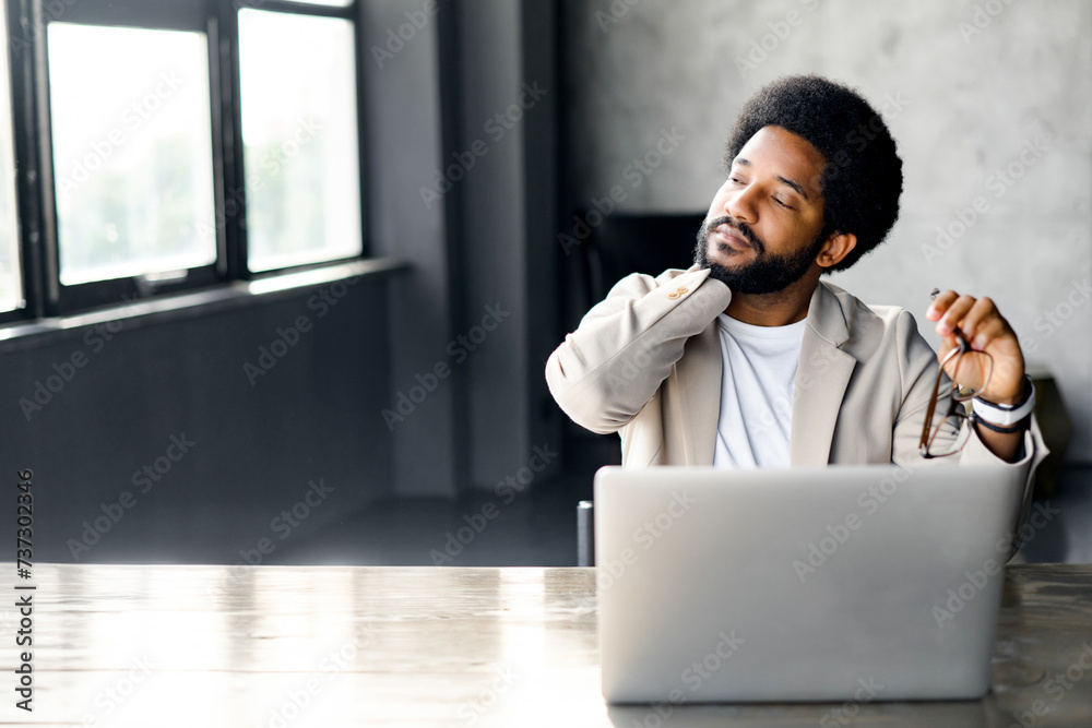 This young office worker embodies relaxation amidst the corporate rush, leaning back with a gentle stretch, a reminder of the need for breaks and self-care during the workday