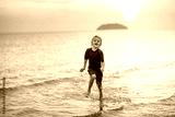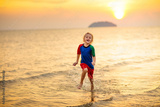 Child playing on ocean beach. Kid at sunset sea.