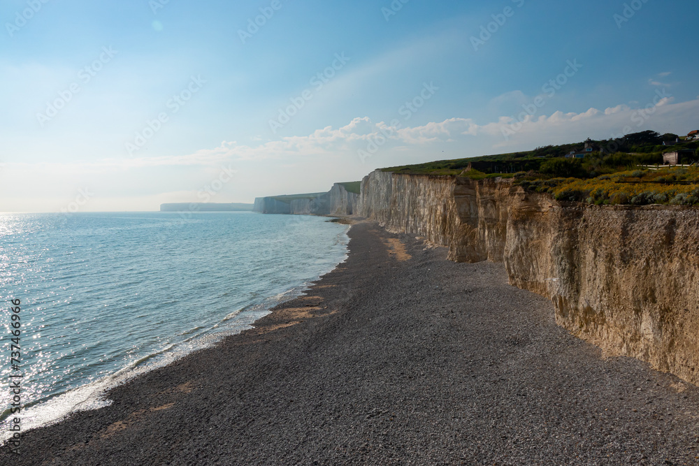 Small ocean waves rolling onto the rocky beach beneath magnificent chalk cliffs