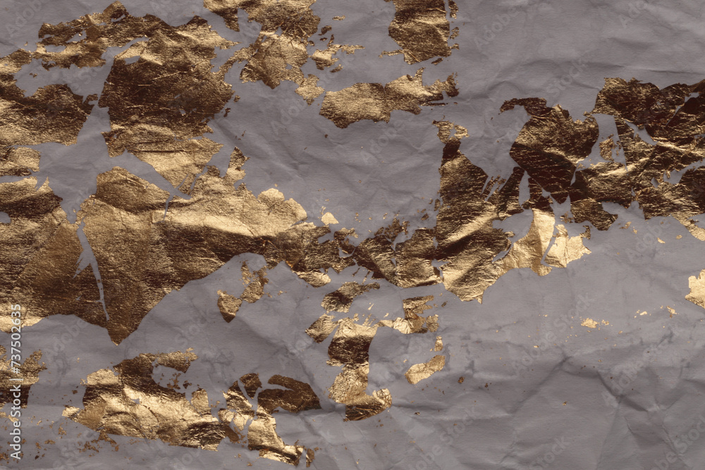 Crumble Paper texture painting glow glitter blot wall. Abstract gold, bronze and beige stain copy space background.