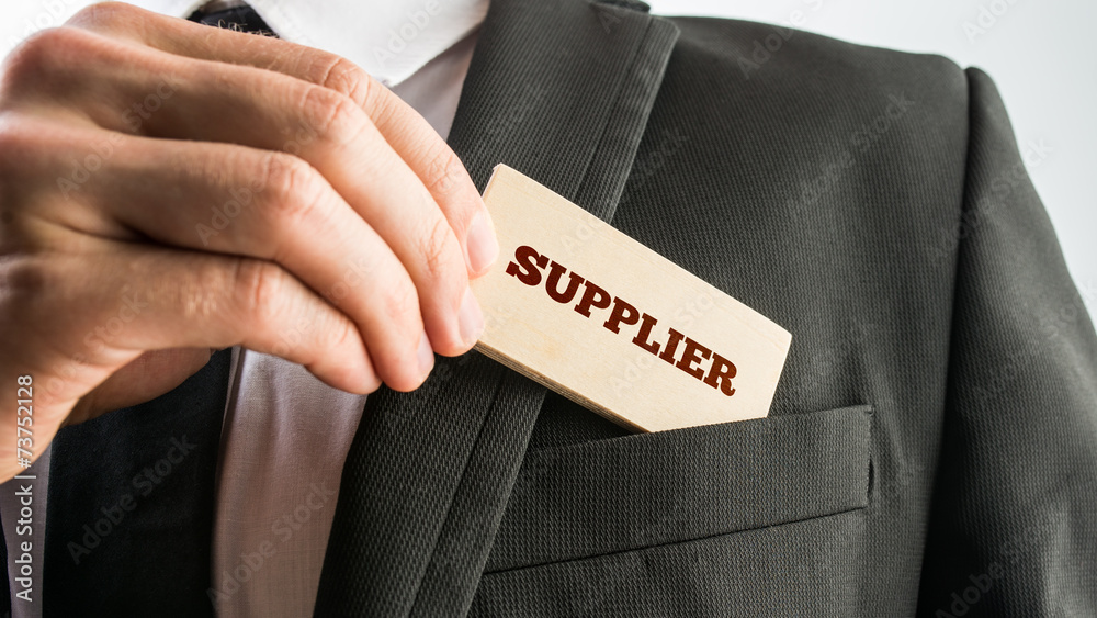 Businessman showing a wooden card reading Supplier