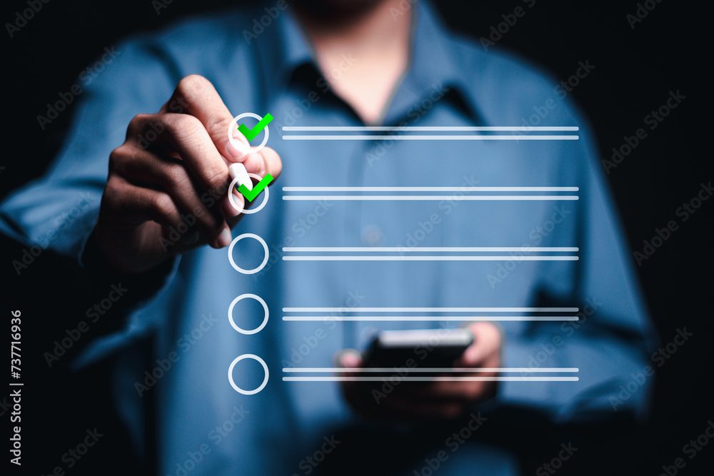 Survey form concept. Questionnaire with checkboxes, filling survey form online, answer questions of test. Businessman use smartphone to check mark on check box on virtual screen.
