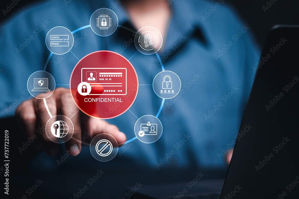 Employee confidentiality concept. Managing corporate files and employee information. Person use laptop with confidential word and icon on virtual screen to access documents data and cyber security.