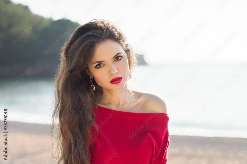 Attractive girl model outdoor portrait, fashionable woman with r