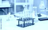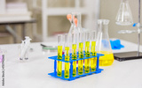 Glassware test tubes, beakers with various colored liquids on table, Study for making a vaccine to protect, Lab interior background. Chemical laboratory research and development science concept.