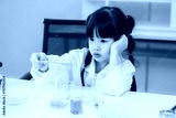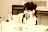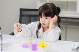 Asian little cute girl students in lab coat thinking making test tube science experiments chemical laboratory in study room at school. Education research and development concept learning kids.