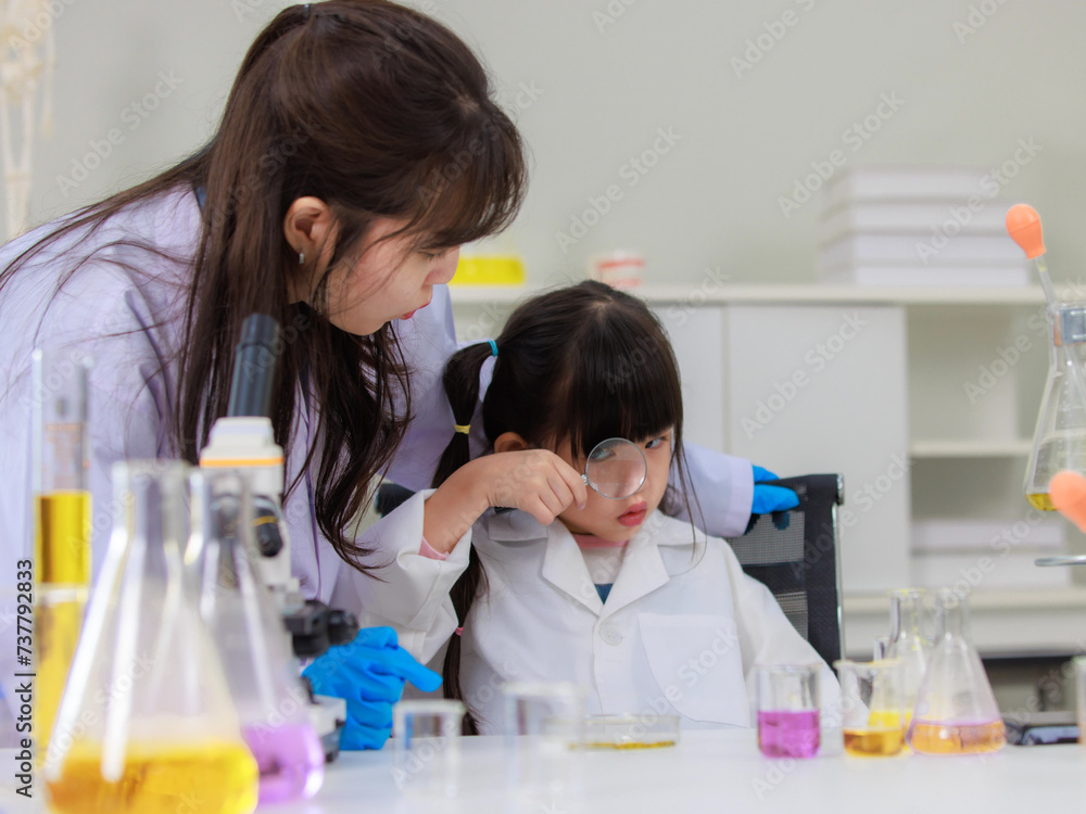 Asian woman scientist and little girl looking through magnifying glass making science experiments tests have microscope at chemical laboratory study room. Education concept learning for kids