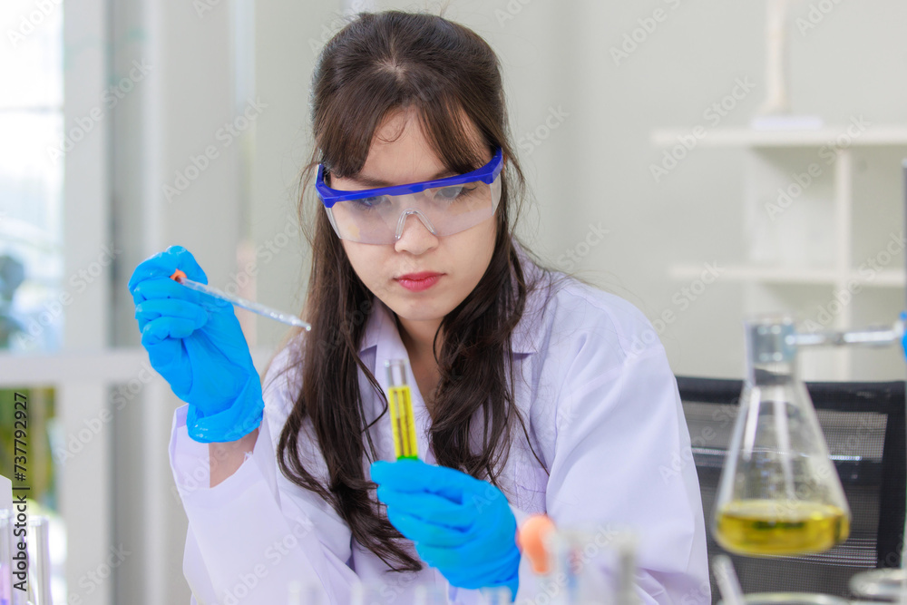 Asian young woman female laboratory assistant professional scientist concentrated in a white lab coat and protective eyeglasses making test tubes research medicine experiments in chemical lab