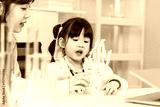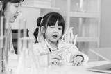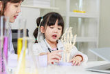 Asian woman doctor physiotherapist explains human fake body skeleton model on a table to little children girl at laboratory study room. Education anatomical human concept learning for kids.