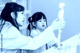 Asian woman doctor physiotherapist explains human fake skeleton hand model on a table to little cute children girl at laboratory study room. Education anatomical human concept learning for kids.