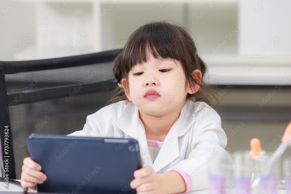 Asian little girl scientist in lab coat reading tablet computer for data learning science at chemical laboratory study room. Education research and development concept learning for kids.