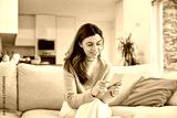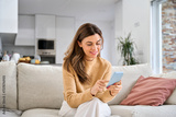 Happy mature older woman using smartphone sitting on couch at home. Smiling middle aged woman looking at cell phone messaging or doing ecommerce mobile shopping relaxing on sofa in living room.