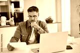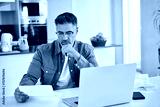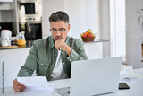 Worried stressed middle aged mature man wearing eyeglasses looking at paper bill checking insurance invoice or tax document calculating expenses working at home kitchen using laptop computer.