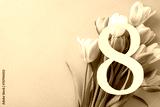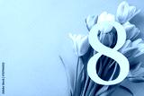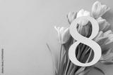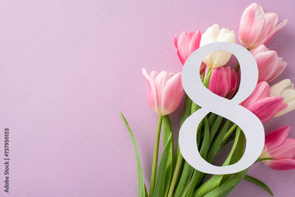 Women's Day top view composition: The number 8, framed by a bouquet of tulips, positioned on a light purple background, offering ample space for customized text