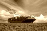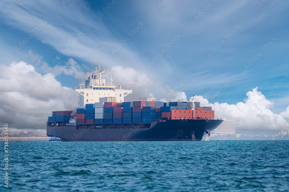 Transportation ship logistics and container dock cargo yard with working crane bridge i transport logistic import export open sea with blue sky background.