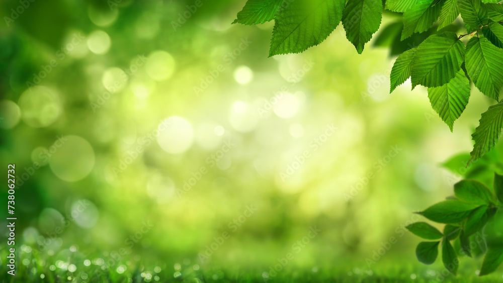 Green leaves framing a stylish natural bokeh background. Ideal as copy space. The beauty of nature as a graphic design concept.